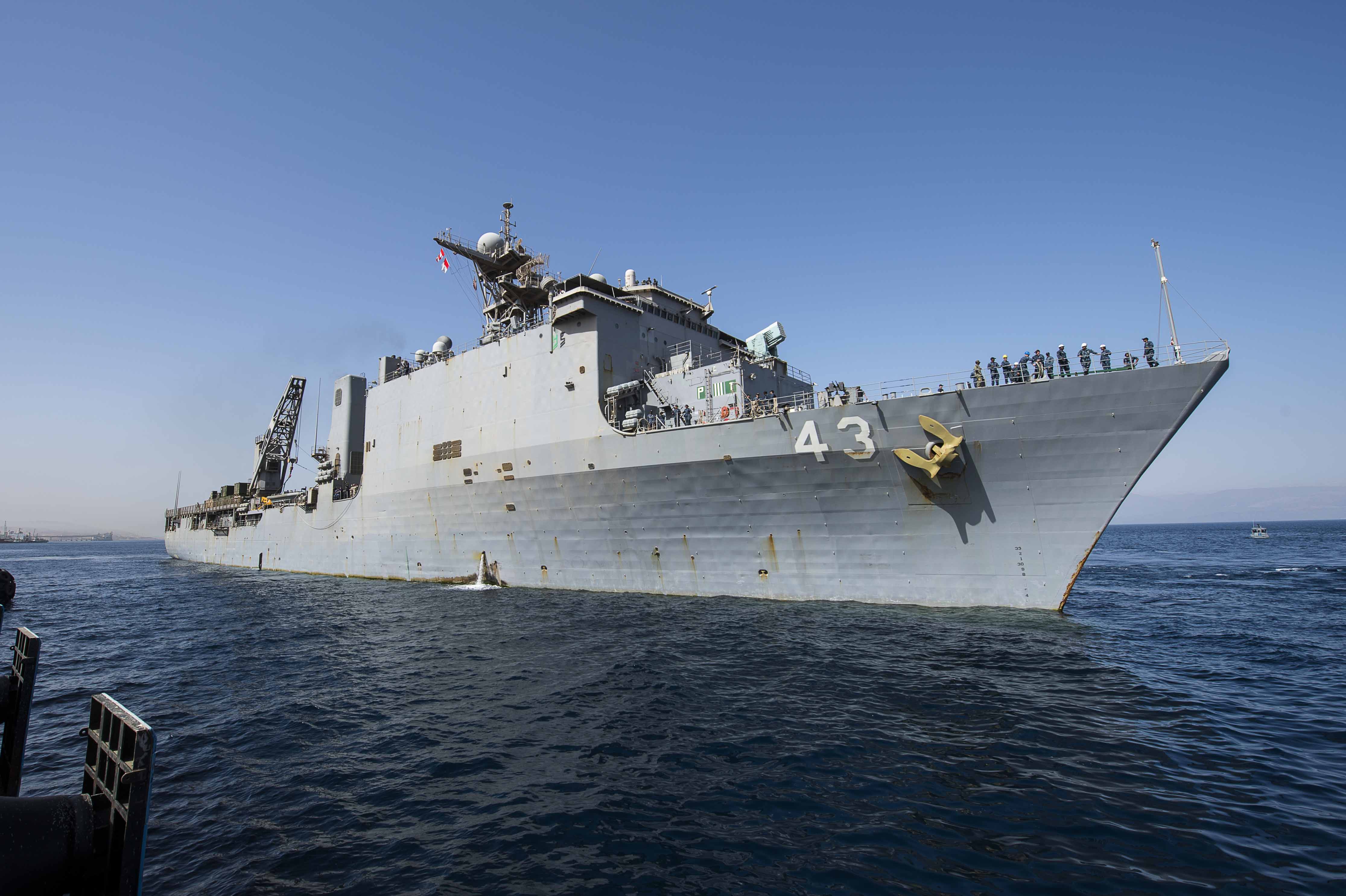 565k | USS Fort McHenry (LSD-43) prepares to dock near the Royal Jordanian Naval Force Base in support of exercise Eager Lion 2015.