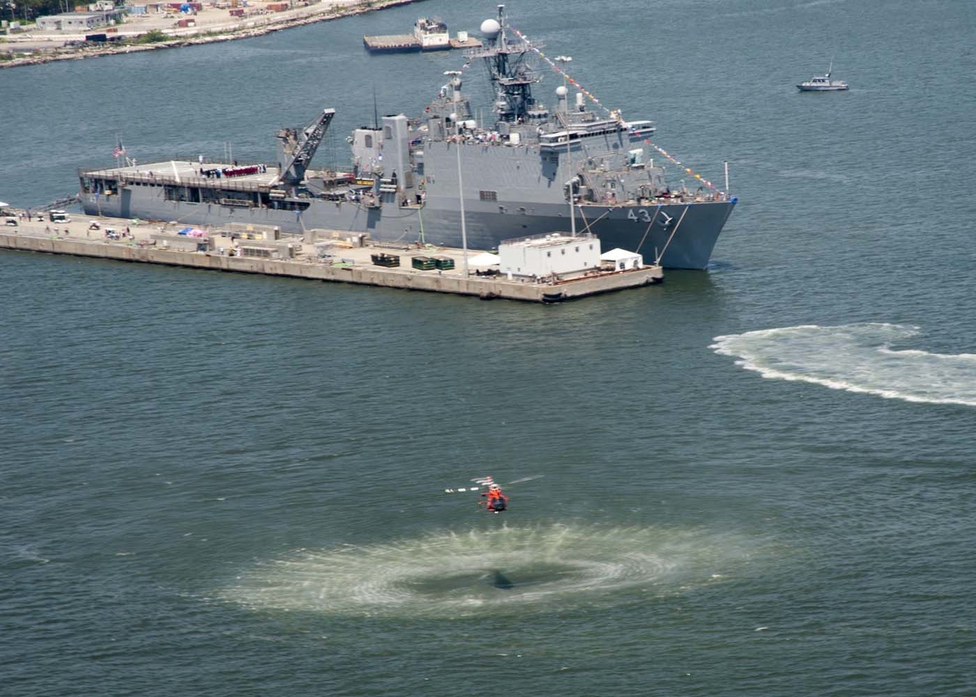 201k | USS Fort McHenry (LSD-43) moored pierside during the 2016 Fleet Week celebration in New York City as a Coast Guard Aviation