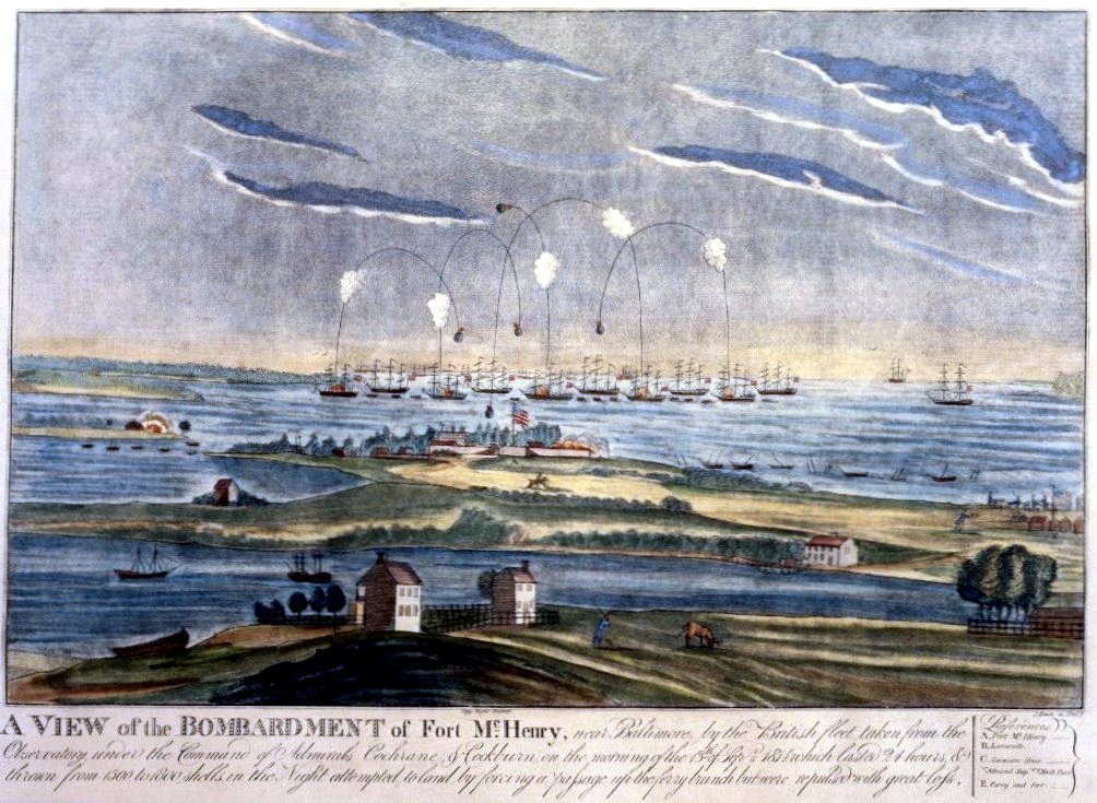 185k | Caption - "A VIEW of the BOMBARDMENT of Fort McHenry, near Baltimore, by the British fleet taken from the Observatory under the Command of Admirals Cochrane & Cockburn on the morning of the 13th of Sept 1814 which lasted 24 hours & thrown from 1500 to 1800 shells in the Night attempted to land by forcing a passage up the ferry branch but were repulsed with great loss." |