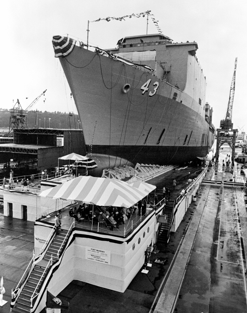 295k | Fort McHenry (LSD-43) ready for launching, 1 February 1986 at Lockheed Shipbuilding Corp, Seattle, WA.