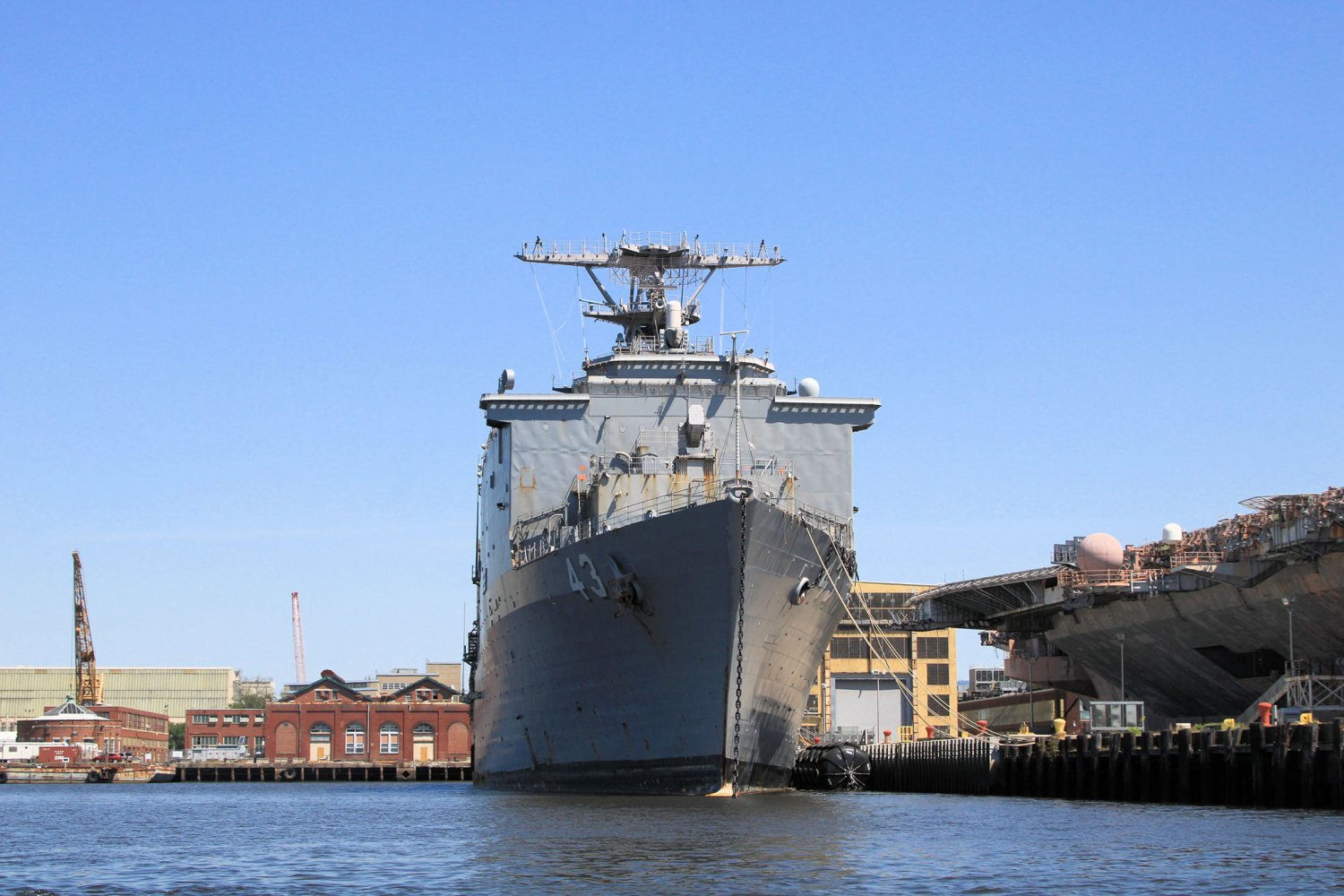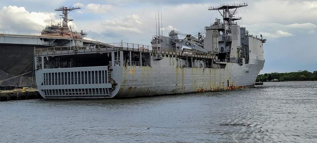 72k | The decommissioned USS Fort McHenry (LSD-43) moored at the Naval Inactive Ship Maintenance Facility Philadelphia, PA. in May 2021. Fort McHenry is tied up across the pier from the decommissioned aircraft carrier, USS John F. Kennedy (CV-69). Fort McHenry was decommissioned, 27 March 2021, at Naval Station Mayport, FL.. | Photo by Rob Larson | |
