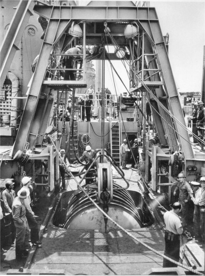170k | USS LSM-60 with the midships hoist being used to lower the cassion into the ship's hold for "Operation Crossroads" Test Baker at Bikini Atoll. US Navy photo. |