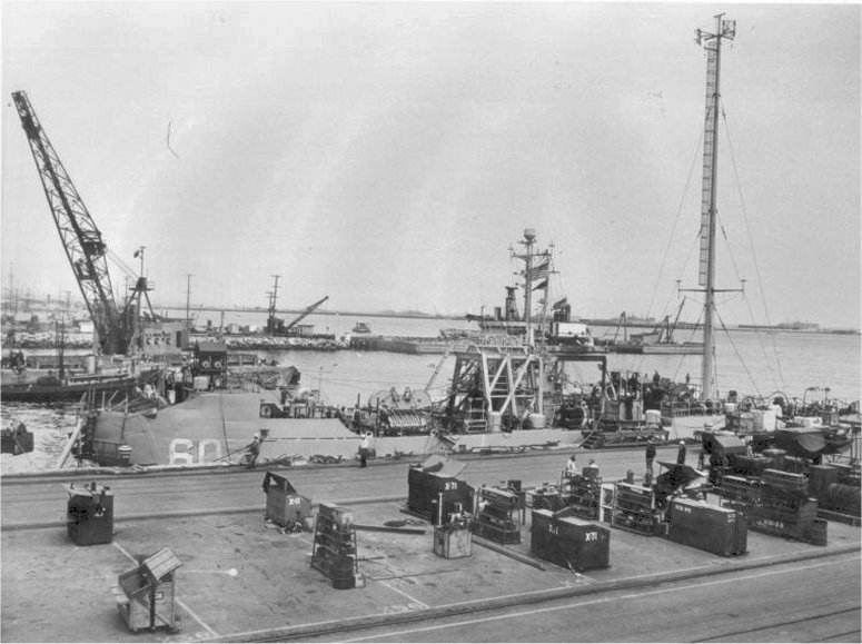 80k | USS LSM-60 moored pierside at the shipyard while work progresses on her preparation for "Operation Crossroads" Test Baker. US Navy photo. |
