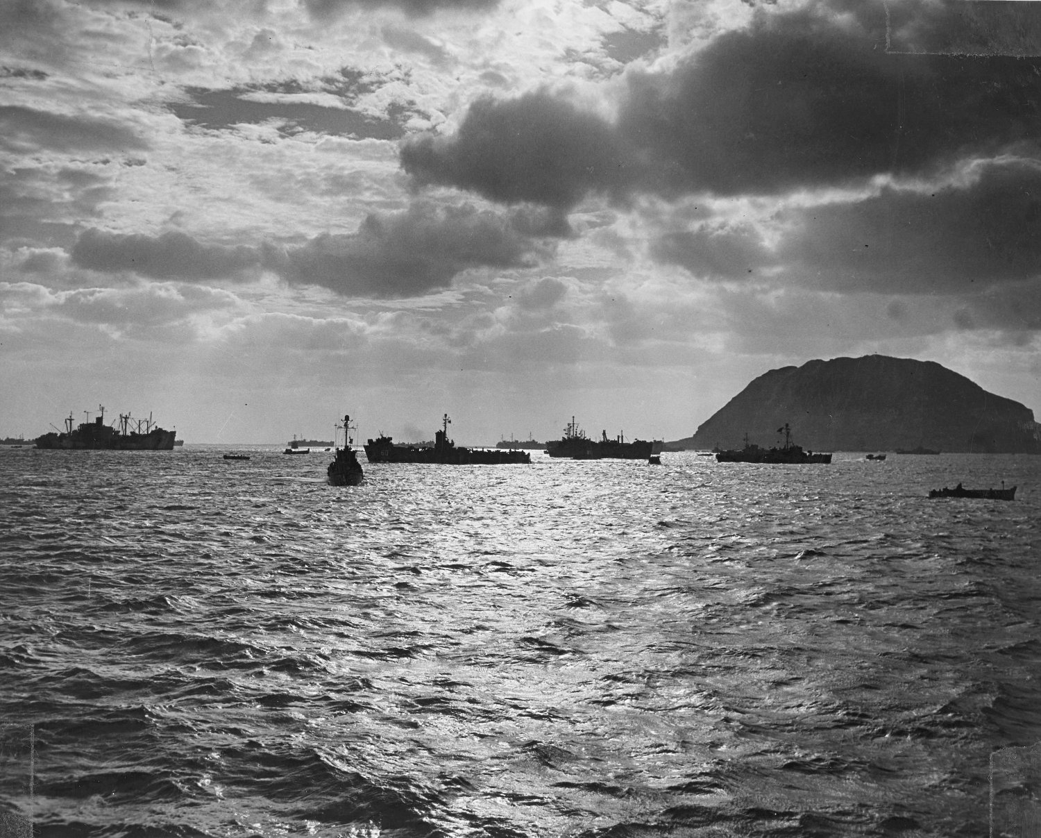 the invasion fleet off Iwo Jima, to the right in the photograph. This image depicts the black slopes of Mount Suribachi looming in the distance as the American Task Force