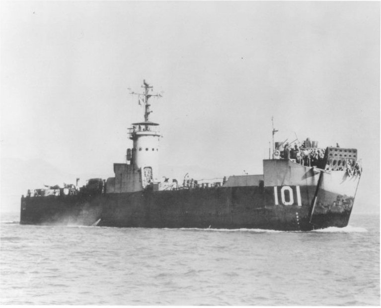 USS LSM-101 beached at the Loran Station at O Shima, Japan (south of Tokyo Bay) |
