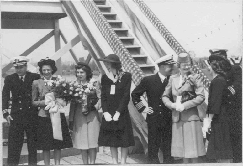 75k | USS LSM-208 launching ceremony, 10 May 1944, at Dravo Corporation, Wilmington, DE. Mrs. Elizabeth W. (George H.) Ritter with the rest of the ceremonial party on the launching platform. | Photo by LCDR George H. Ritter, USNR | |