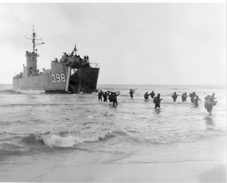 57k | USS LSM-398 beached, while off loading troops during Exercise "Seminole," near Panama City, FL., circa 1947. US Navy photo # NH 91270 from the collections of the US Naval Historical Center |