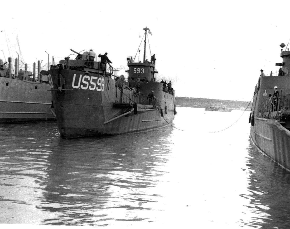 184k | USS LCI(L)-593 preparing to tie up alongside another LCI at Bizerte, Tunisia, circa May 1944 | Photo by Robert W. Van Keuren CO USS LCI(L)-665 | |