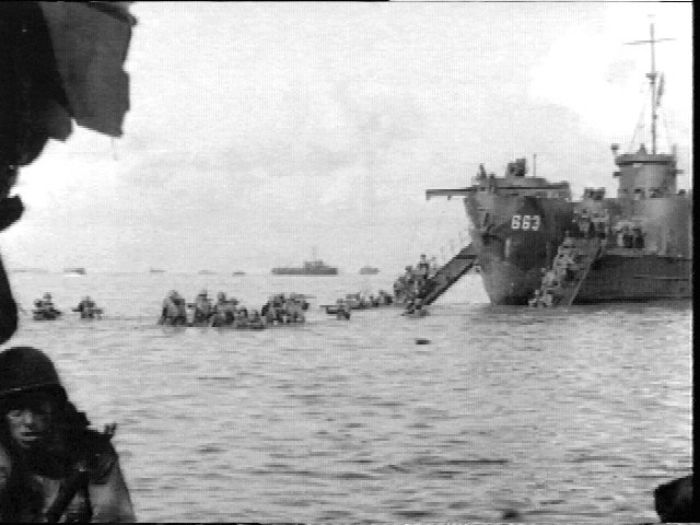 59k | USS LCI(L)-663 landing troops from the 126th RCT of the 32nd Division at Morotai, the northernmost of the Moluccas Islands, 15 September 1944. US National Archives image. |