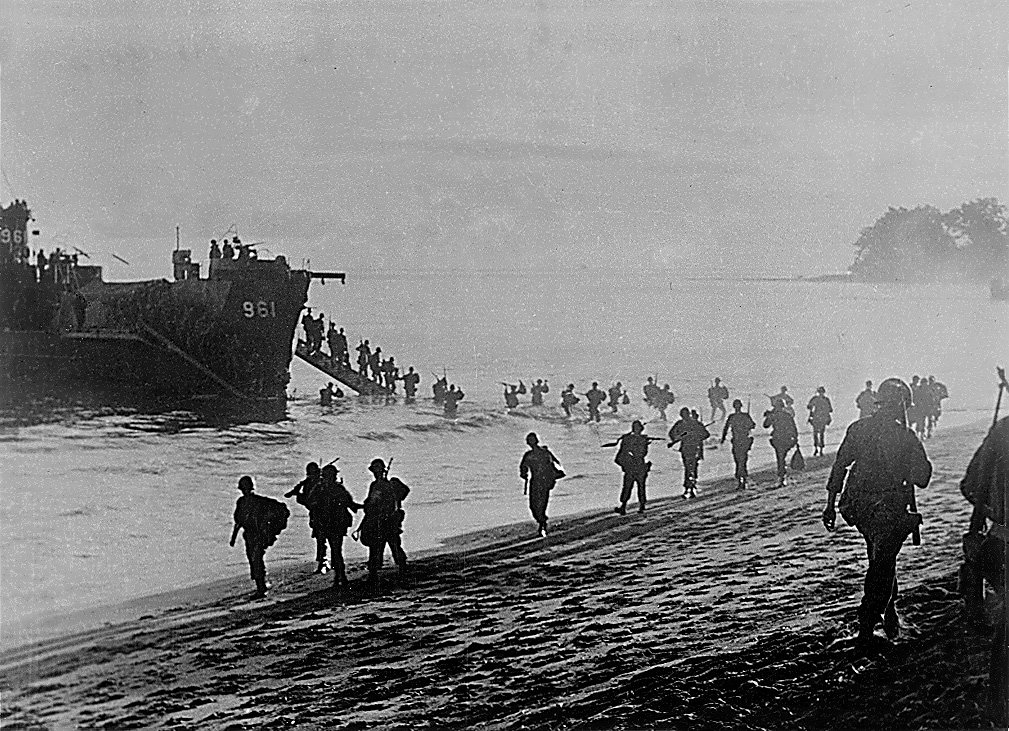 249k | USS LCI(G)-961 unloading troops Cape Sansapor, late July early-August 1944. U.S. Navy Photo 127-9> |