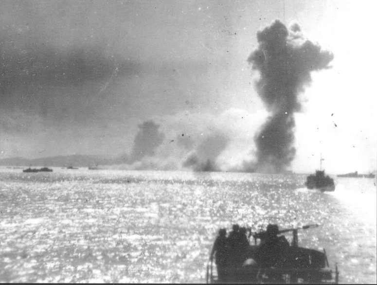 70k | A view from the con of USS LCI(L)-966 as the Mariveles, Bataan, Luzon landing force comes under fire from the heavy guns of Corregidor Island, 15 February 1945. Photo from the USS LCI National Association's 2005 calendar, courtesy of Frank Slatinshek Group 43 Commander. | Ardie Hunt | |