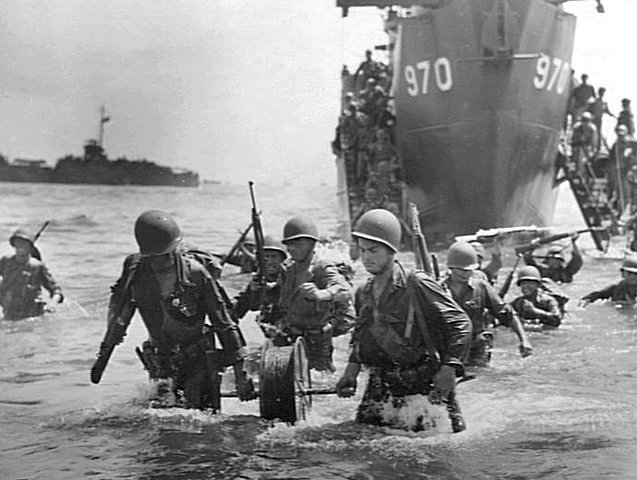 66k | USS LCI(L)-970 disembarking 31st Division troops at Morotai Island, New Guinea, 15 September 1944. The troops are following