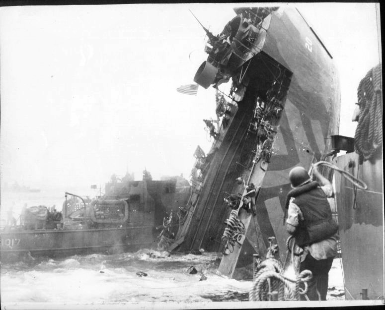 64k | USS LSM-20's stern is awash and water is flooding the well deck after the Kamikaze attack at Surigao Strait, 5 December 1944. USS LCI(G)-1017 is off her port side attempting to rescue LSM-20 crew members. | USS LSM / LSMR Association | |