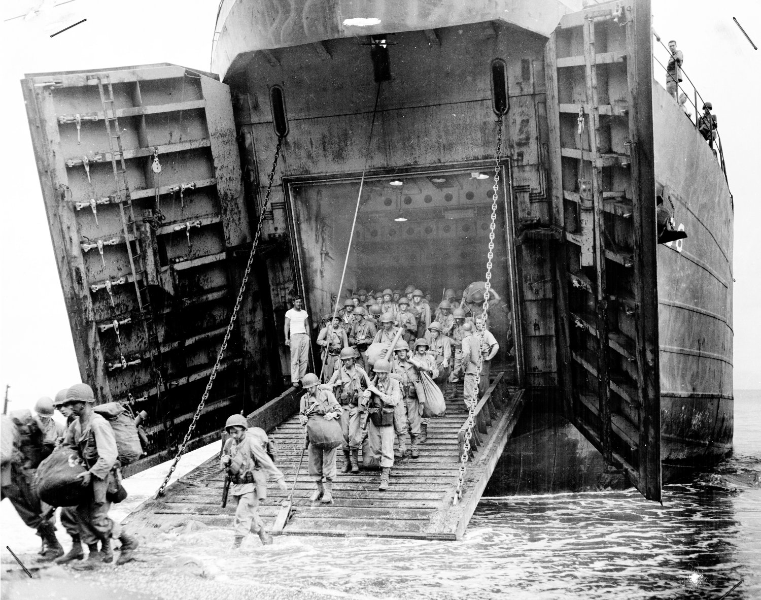 122k | US Army 40th Infantry Division troops wade ashore from USS LST-68 at Panay Island, Philippines, date unknown. US Army Signal Corps photo. |