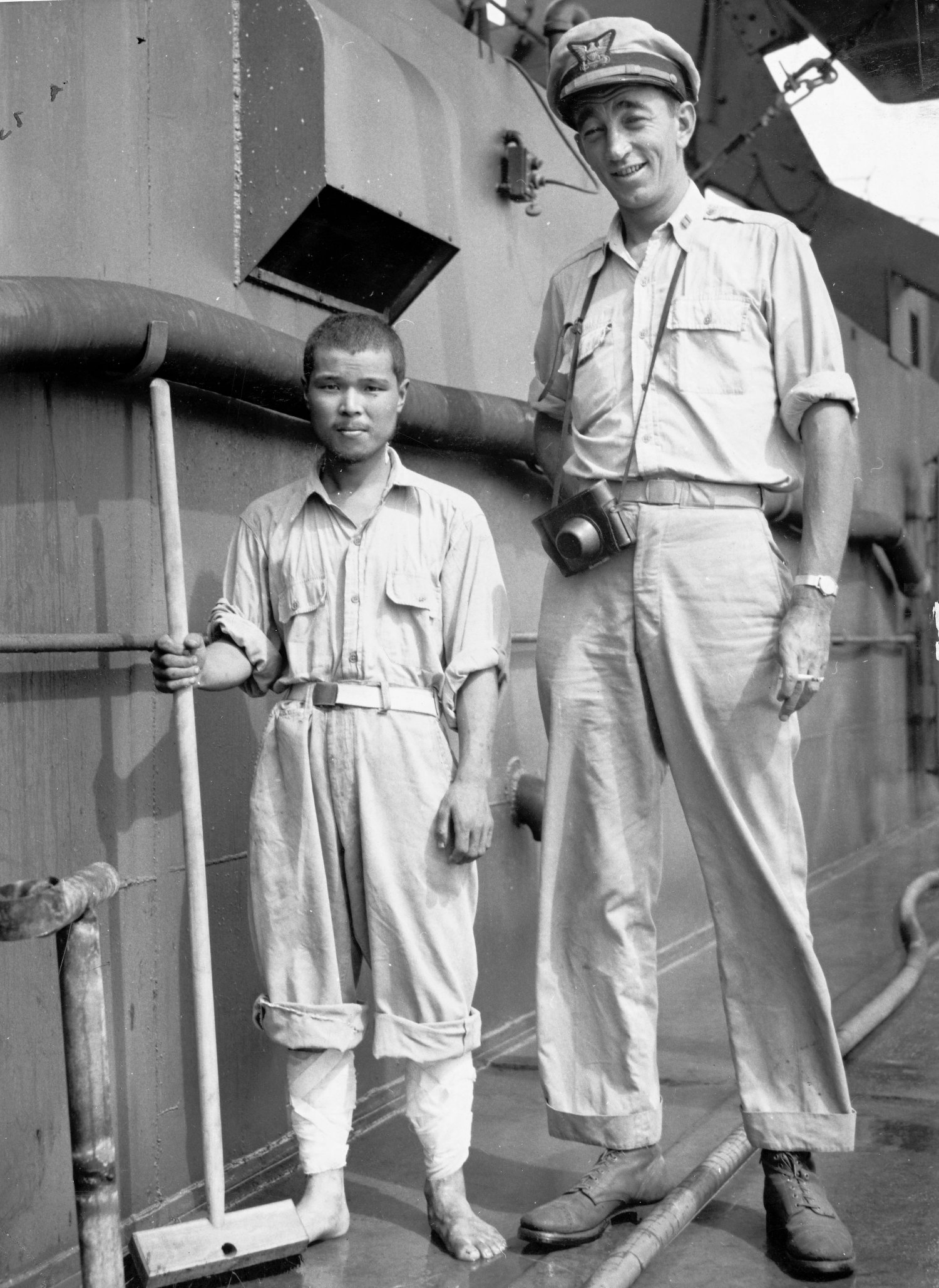 265k | Japanese Prisoners of War being transported aboard USS LST-68 to a base camp help U.S. Coast Guard sailors scrub down the deck, circa December 1943 to February 1944.