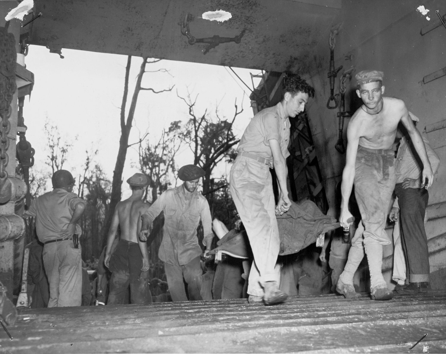 263k | Stretcher bearers and USS LST-68 crew members bring wounded soldiers aboard during in a heavy down-pour of rain at Cape Gloucester, New Britain, circa 26-30 December 1943.