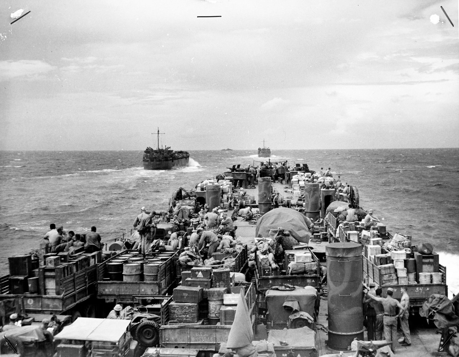 455k | Sometime prior to 14 February 1945, USS LST-68 leads USS LST-18 as the invasion armada moves on Luzon.