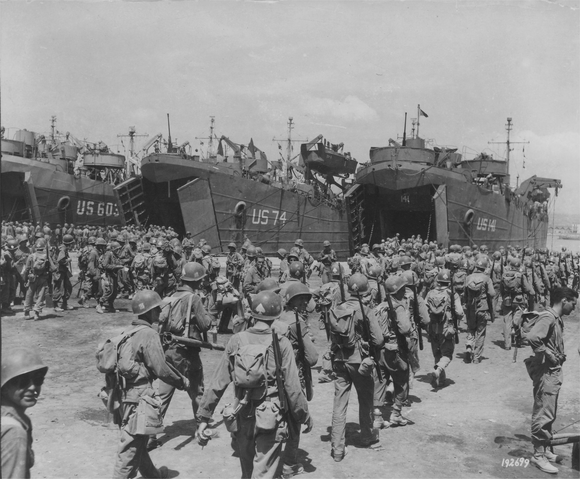 171k | USS LST-526, USS LST-140, USS LST-74 and USS LST-174 loading for the invasion of southern France, at Naples, Italy, August 1944 | Rich Heller Sgt. William Heller's World War II Memoirs 3rd Infantry Division, U.S. Army 1943-1945 |