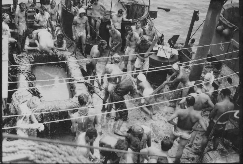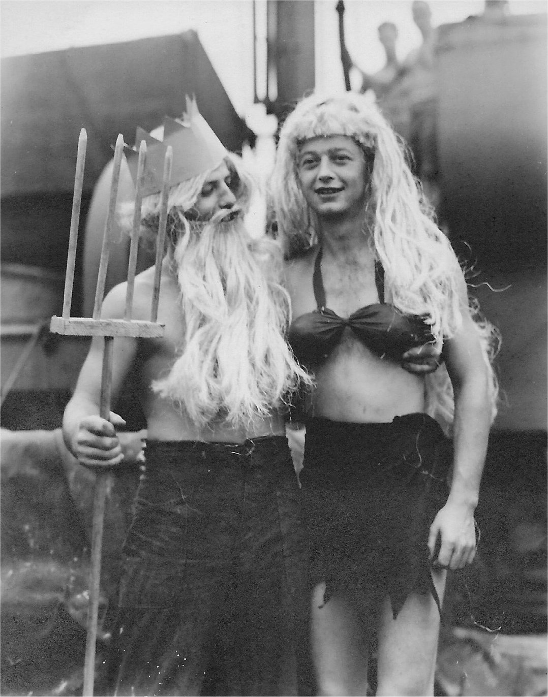 183k | King Neptune and his court arrive aboard USS LST-205 to celebrate crossing the Equator, probably in November 1943 while enroute to the Gilbert Islands, circa November 1943. | Lorne Mullick | |