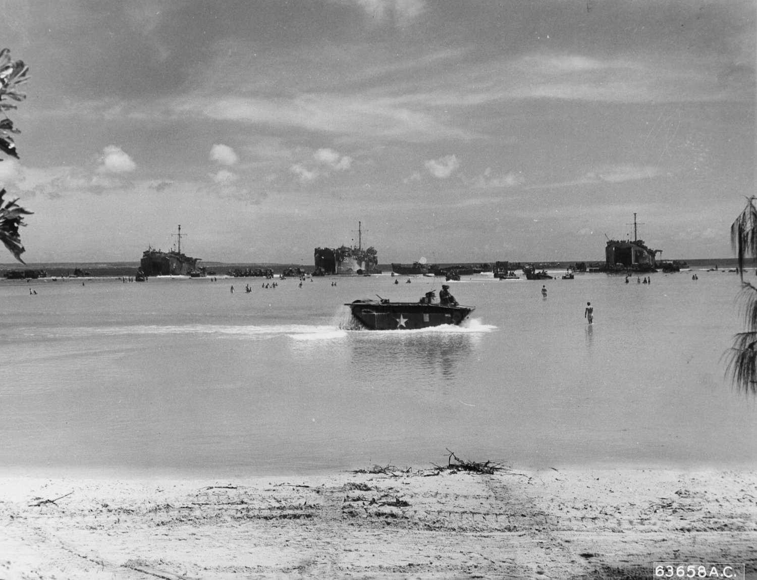235k | USS LST-205 sits on the reef in the background as US Army soldiers of the 804th Engineer Aviation Battalion unload their equipment from an LST, during landing operations on Saipan, Marianas Islands, 21 June 1944.