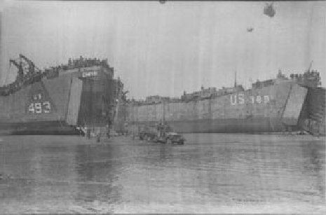 USS LST-493 off loading at Normandy, circa 7 June 1944 to 9 April 1945, USS LST-44 is in the foreground |