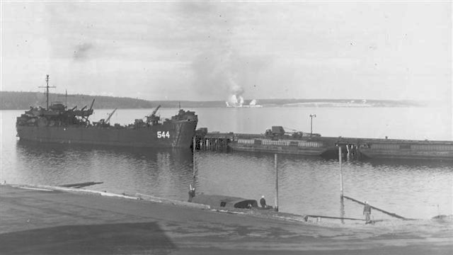 USS LST-544 moored pierside at the US Naval Magazine, Indian Island, WA., date unknown. The smoke and "fire" in the is from the Port Townsend paper mill. Un-numbered US Navy photo now in the collections of the Seattle NARA, Record Group 181, Wartime History of US Naval Magazine, Indian Island, WA. |
