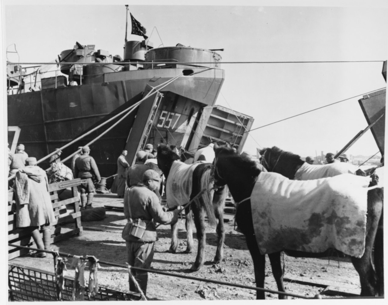 179k | Livestock of the Chinese new 6th Army's 22nd division being loaded aboard USS LST-557 at Shanghai, China, for movement to