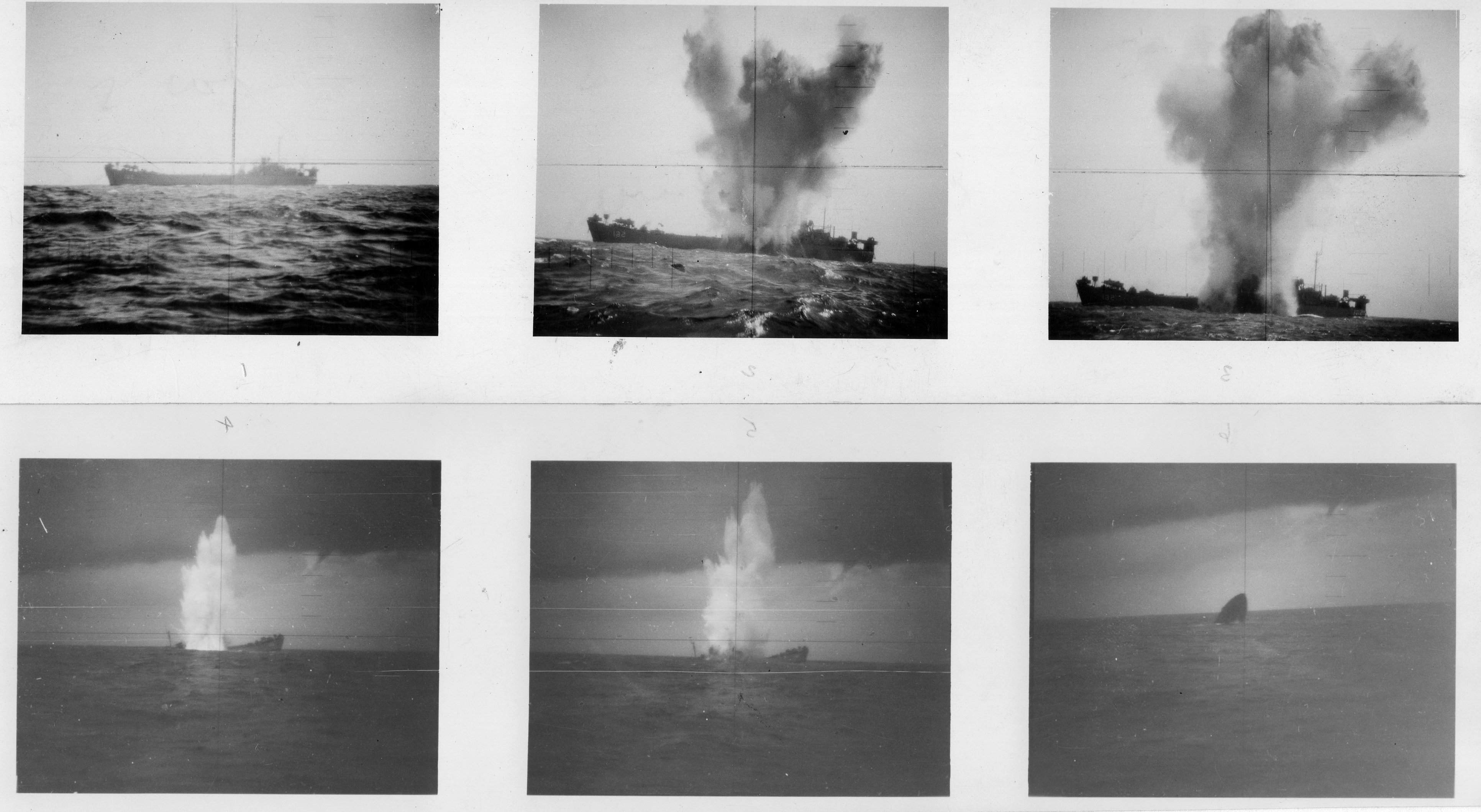 983k | Six periscope images of ex-USS Chittenden County (LST-561) being sunk by a torpedo fired by USS Sargo (SSN-583), 21 October 1958, off Diamond Head, Hawaii. | Darryl Baker | |