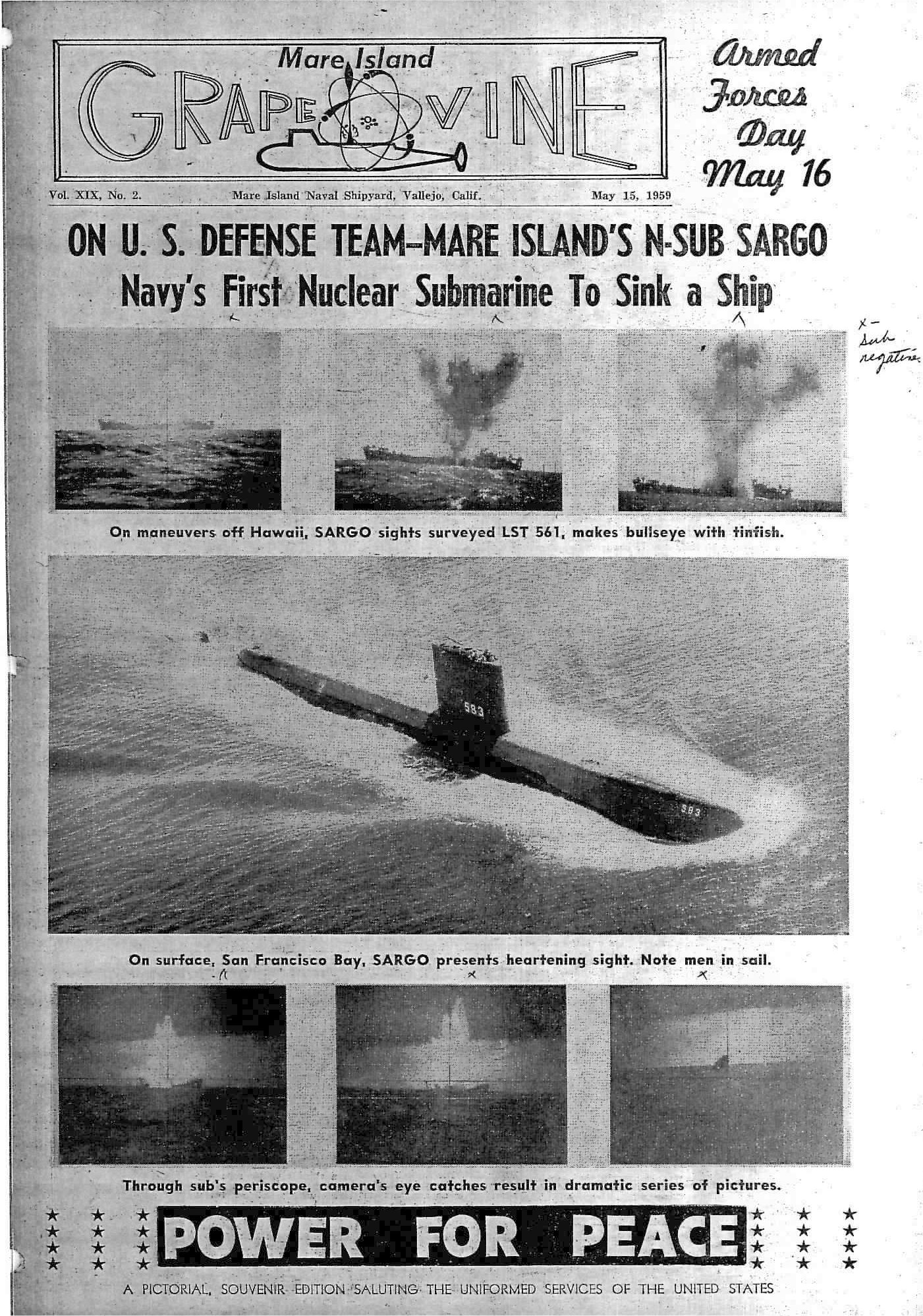 771k | Mare Island Shipyard newspaper the "Grapevine", 15 May 1959 issue with photos of USS Sargo (SSN-583) sinking ex-USS Chittenden County (LST-561), 21 October 1958, off Diamond Head, Hawaii. | Darryl Baker | |