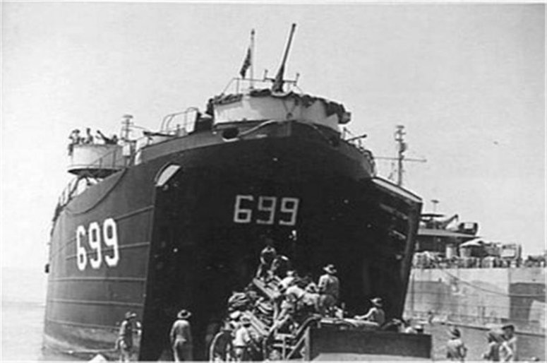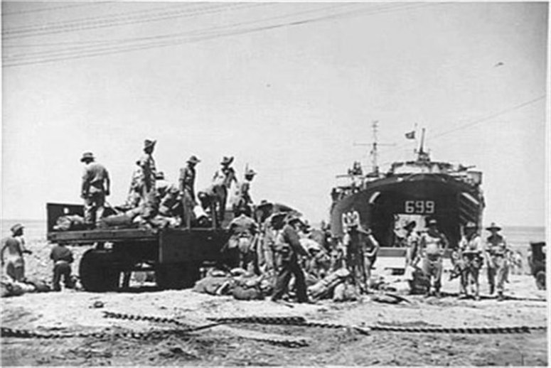 66k | USS LST-699 beached at Blue Beach, Morotai, 17 May 1945, while troops of 5 Airfield Construction Squadron, Royal Australian
