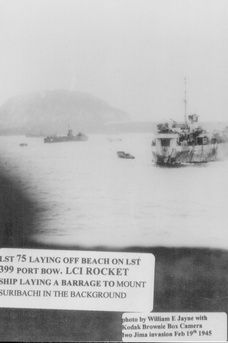 87k | USS LST-715 laying off the beach at Iwo Jima, Green Beach, Volcano Islands. She is off the port bow of USS LST-399. In the background an LSM(R) is laying a barrage of rockets onto the slopes of Mount Suribachi, 19 February 1945. | Photo by William E. Jayne USS LST-399 | |
