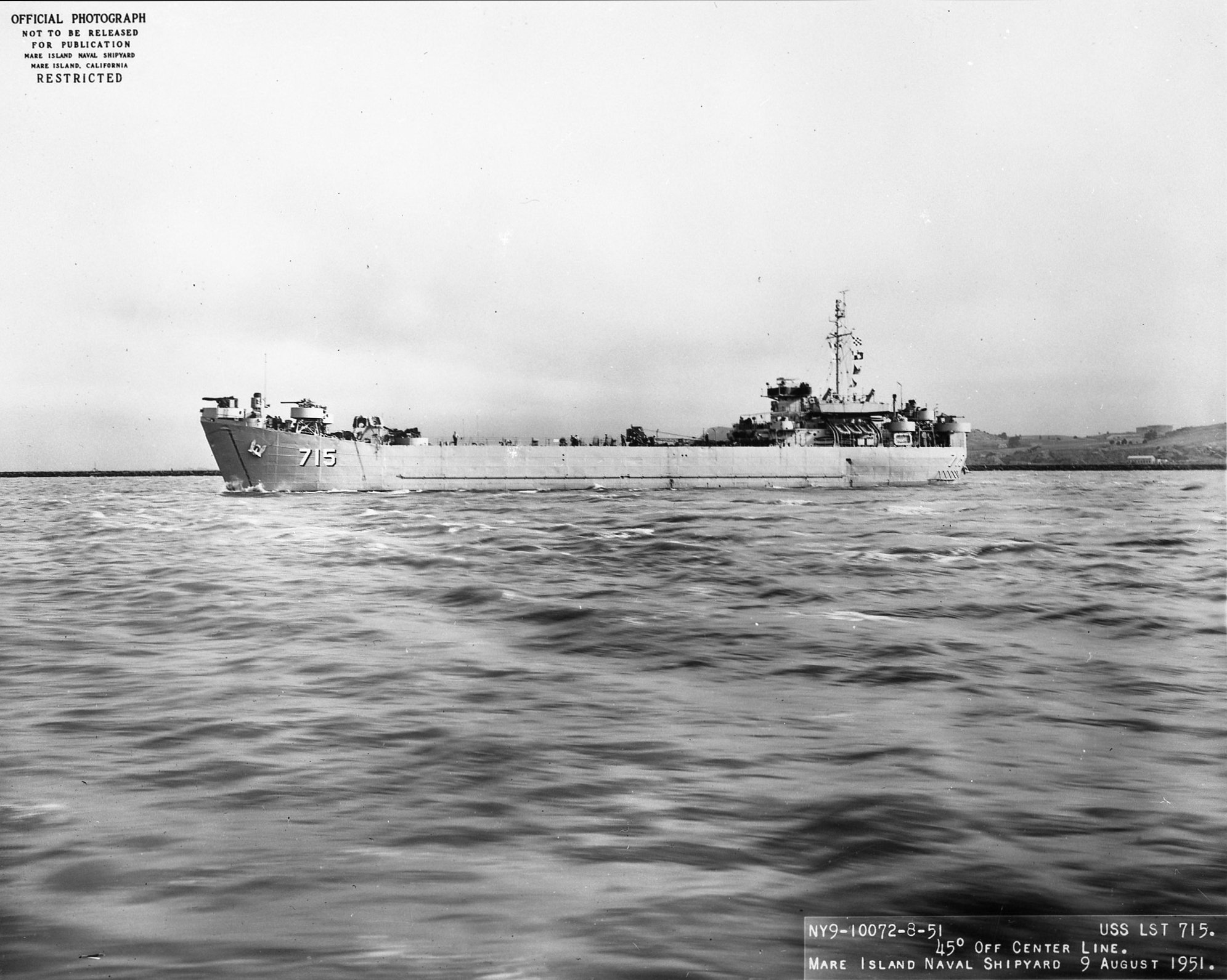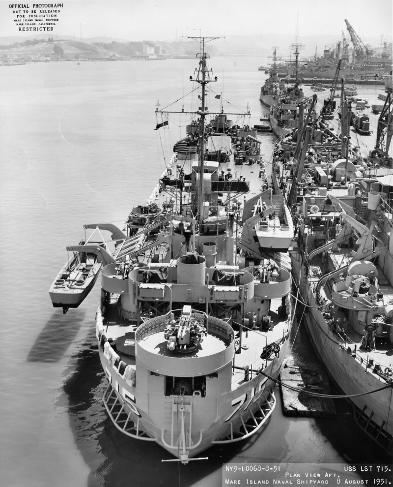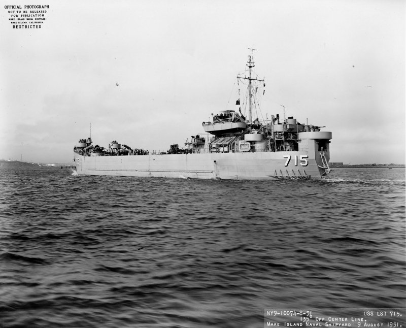 87k | Aft quarter view of USS LST-715 off Mare Island Naval Shipyard, 9 August 1951. Mare Island Naval Shipyard photo # 10074-8-51 8/8/51. |