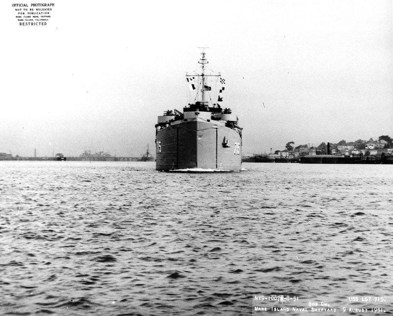109k | Bow on view of USS LST-715 departing Mare Island Naval Shipyard, 9 August 1951. Mare Island Naval Shipyard photo # 10071-8-51 8/8/51. |