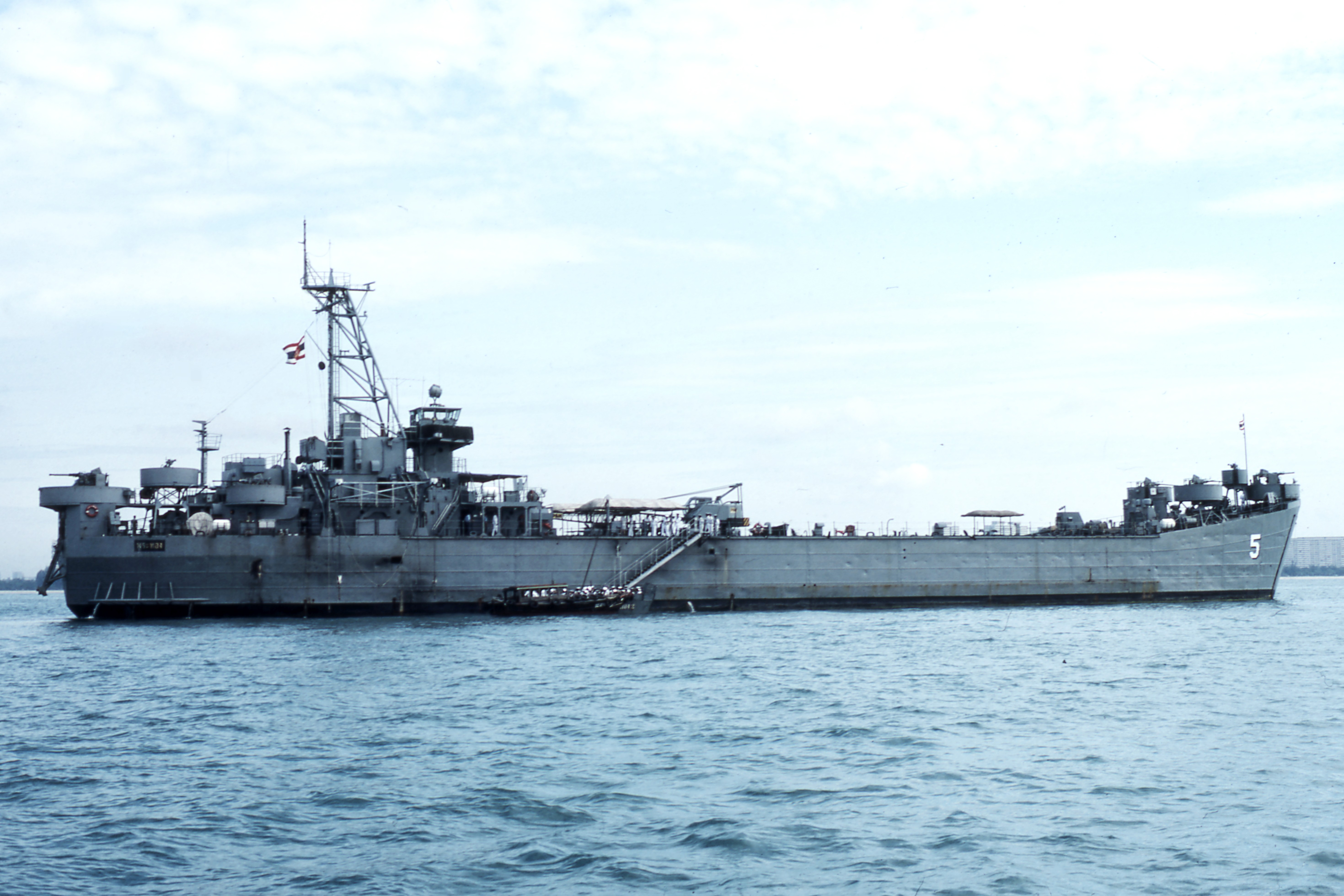 1321k | Ex-USS Dodge County (LST-722) as the Royal Thai Navy's Tank Landing Ship HTMS Prathong at anchor at Singapore, circa 1981. Photos by Don Meehan |