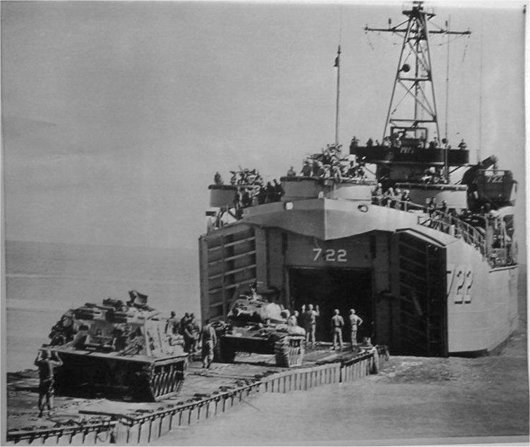 82k | Tanks from the 1st Armored Division roll from the tank deck of USS Dodge County (LST-722) onto a steel causeway to the beach at Hutchinson Island, Fort Pierce, FL. 17 November 1962. AP wire photo |