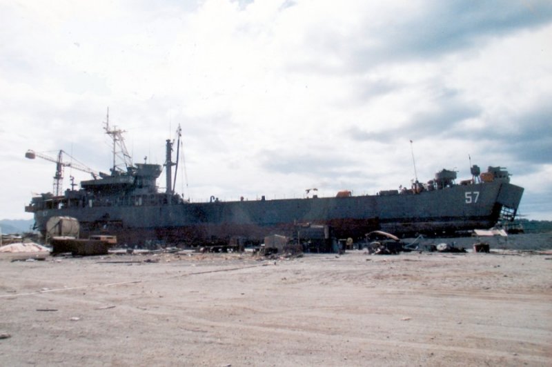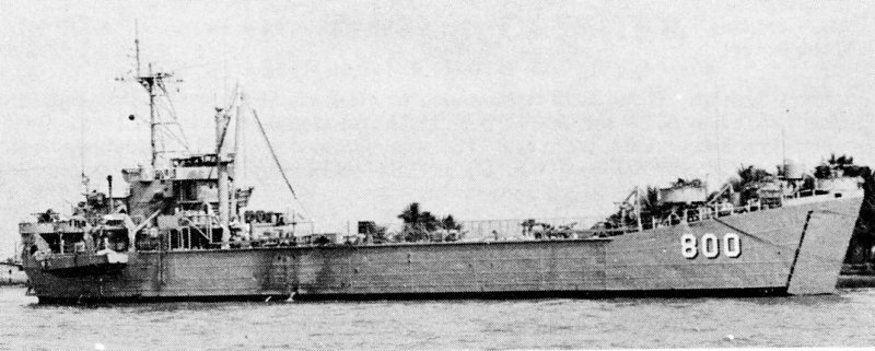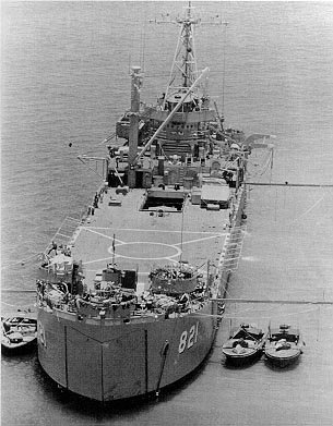 USS Harnett County (LST-821) for transportation to NAS Binh Thuy for repairs. Photo from Seawolf.org. |