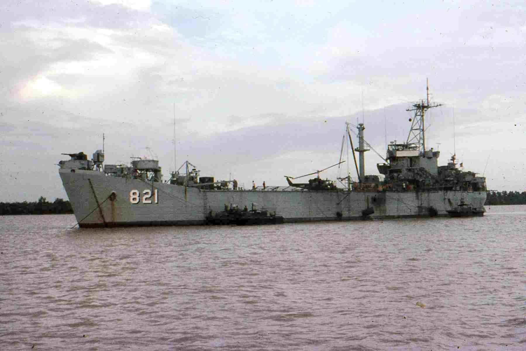 142k | USS Harnett County (LST-821) at anchor in the Co Chien River of South Vietnam's Mekong Delta while serving as a base for Navy river patrol boats and UH-1B "Seawolf" helicopters, circa 1967-70. US Navy photos |