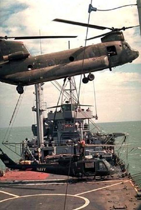 69k | An Army CH-47A “Chinook” heavy-lift helicopter in the process of hooking up a damaged UH-1B Seawolf helicopter from the deck of