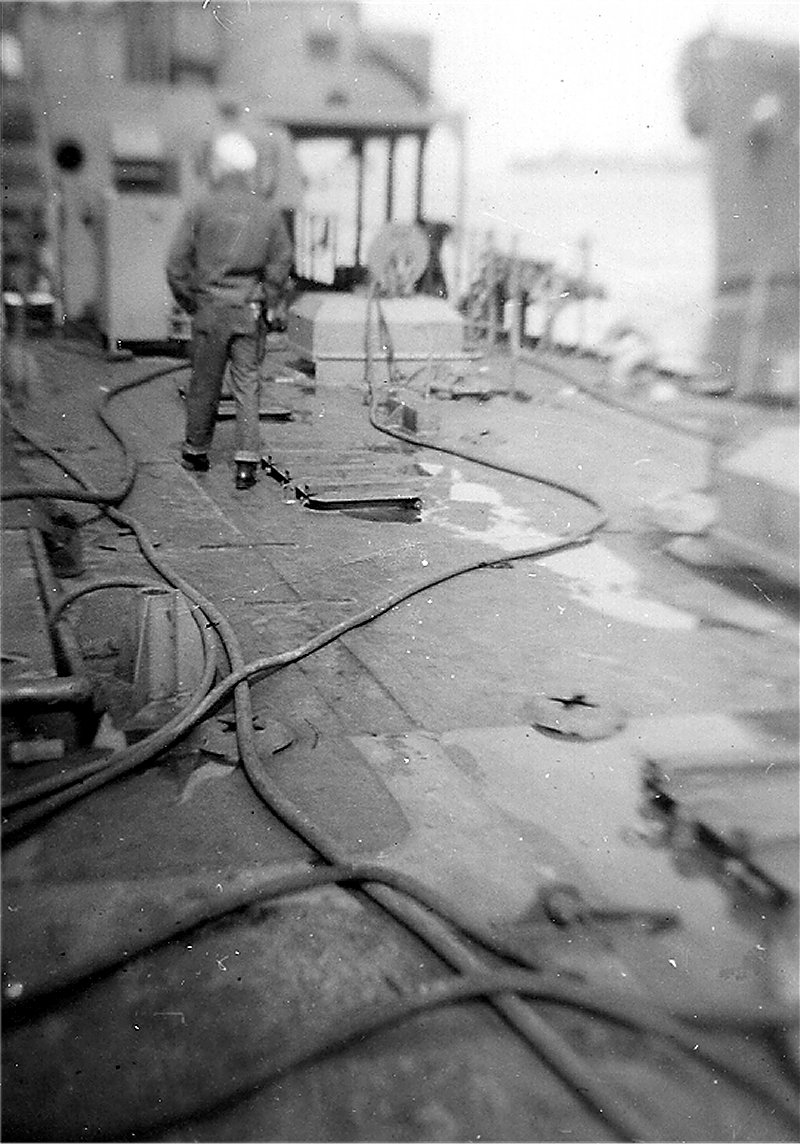 221k | USS LST-865 main deck looking aft while moored in a shipyard, date and location unknown. | Mark Singleton for his father William Singleton s1/c USS LST-865 | |