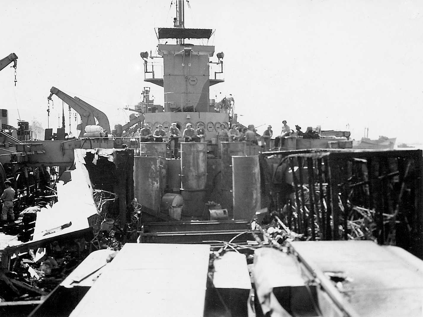 322k | The bow and midsection of LST-884 being salvaged, 9 July 1945. She was too damaged to be of any use and was sunk later in 1946.
