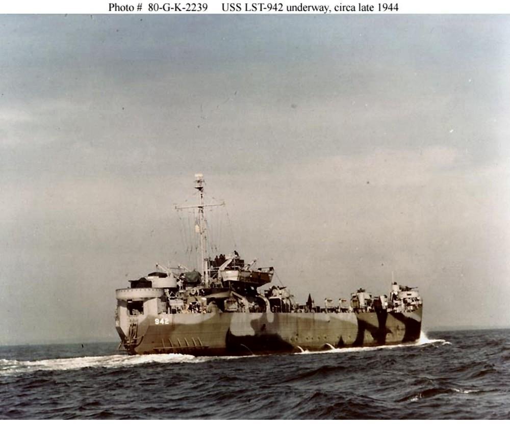 94k | USS LST-942 under way soon after completion, circa late 1944. LST-942 is painted in Camouflage Measure 31, Design 8L or Design 18L. US National Archives photo # 80-G-K-2239 (Color), a US Navy photo now in the collections of the US National Archives. |