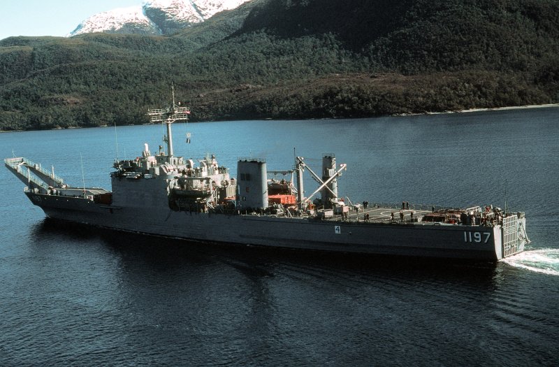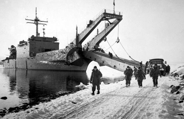 53k | USS Barnstable County (LST-1197) at Nordbynes, Norway, as troops and vehicles disembark during the NATO exercise Cold Winter (Coldex-Flotex`81), 1 March 1981. Photo by JO1 Gary Miller USN Department of Defense photo # DNSN8201126 |