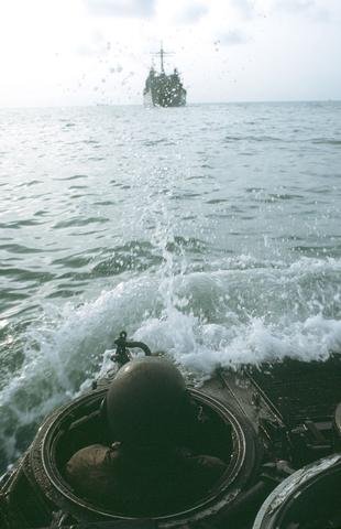 30k | A Marine looks out from the hatch of an AAVP-7A1 amphibious assault personnel vehicle as it returns to USS Barnstable County (LST-1197) during the ships 1991 West African Training Cruise, 1 November 1991. Photo by PH1(SW) Michael D.P. Flynn USN Department of Defense # DNST9205911 |
