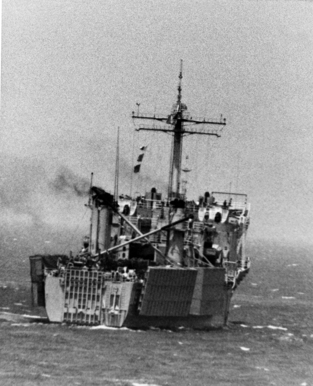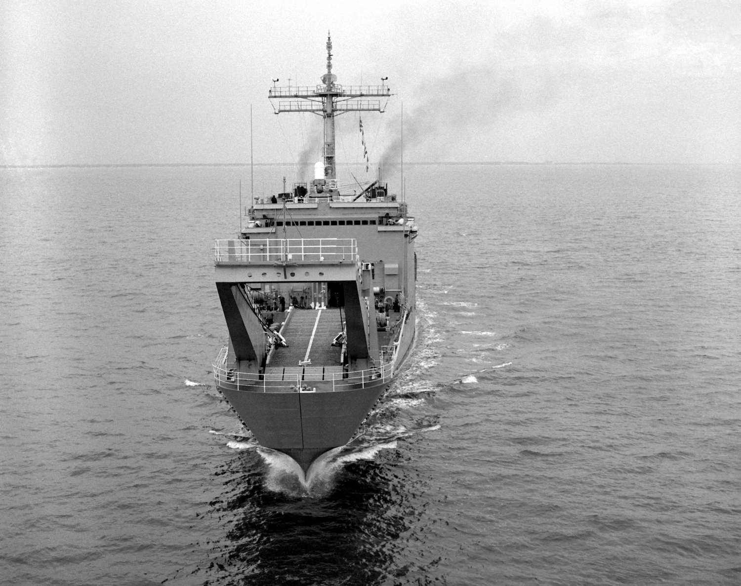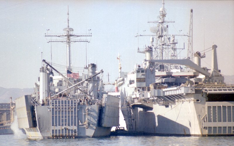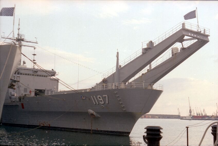 83k | USS Barnstable County (LST-1197) at Barcelona, Spain, 2 January 1982. View of the stern ramp which permitted unloading amphibious vehicles into the water while the ship was underway, "mated" to a landing craft, a causeway, or beached. The anchor helped to retract the ship off the beach. USS Raleigh (LPD 1) is alongside outboard. | Photo by Fabio Peña | |