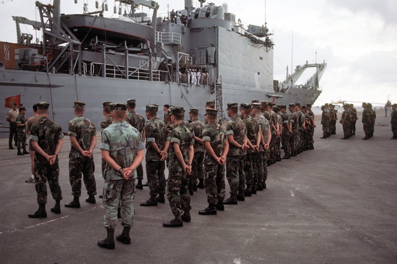 96k | Marines assigned to USS Barnstable County (LST-1197) stand in formation on a pier in Libreville, the capital of Gabon, during the ship's 1991 West African Training Cruise, 19 November 1991. DVIC photo # DN-ST-92-05901 by PH1 Michael D. P. Flynn, USN, from the collections of the Defense Visual Information Center |