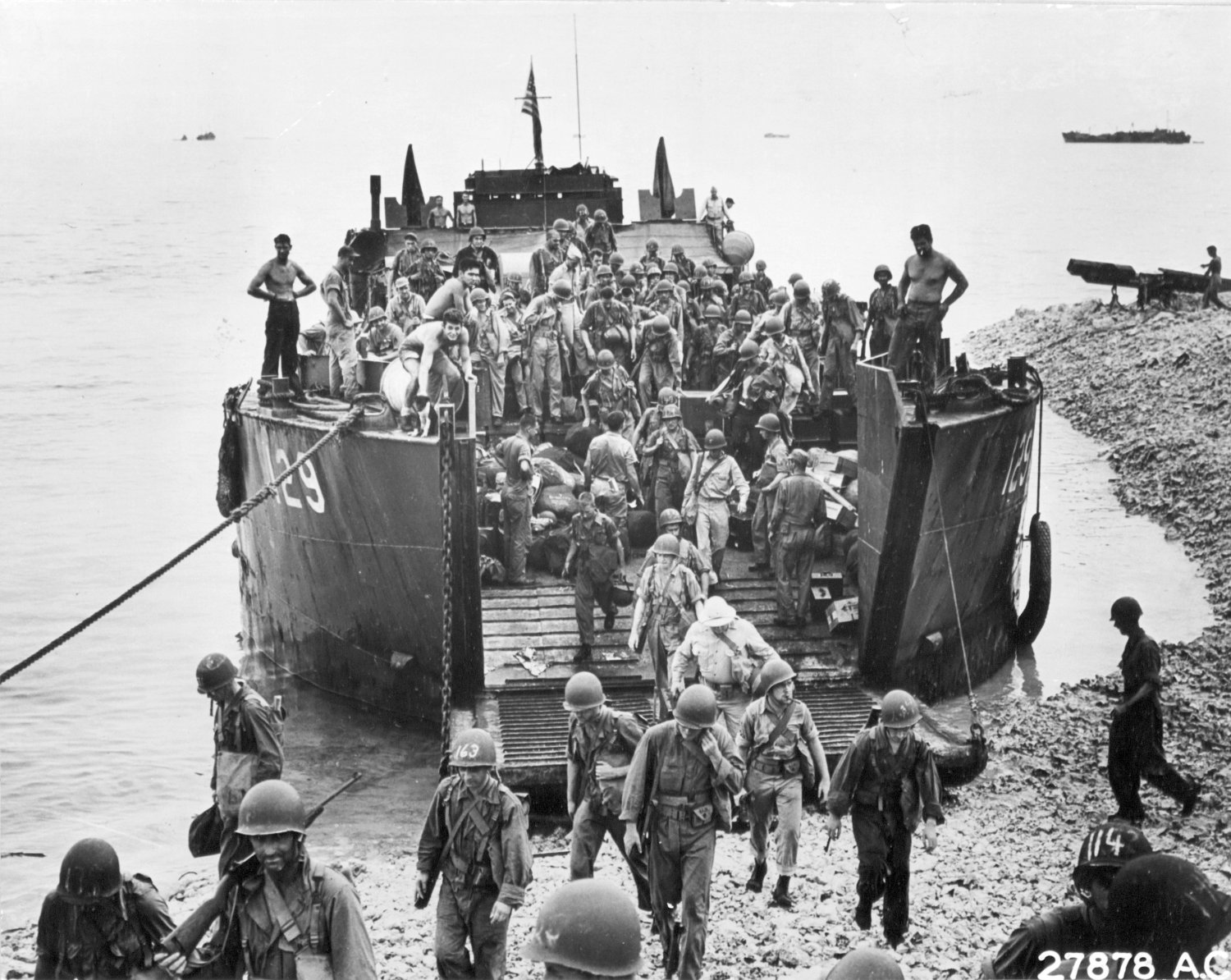 250k | LCT(5)-129 approaching the beach at Funafuti Atoll, Ellice Islands, while transporting US Army Air Corps personnel ashore from