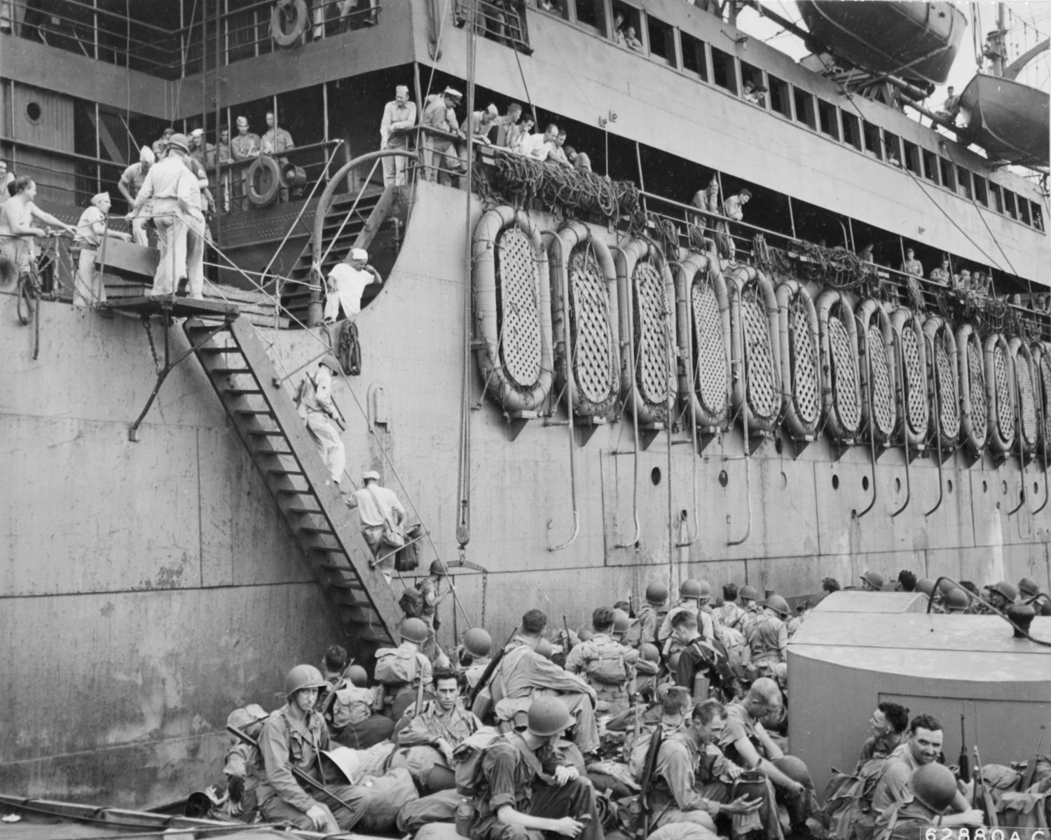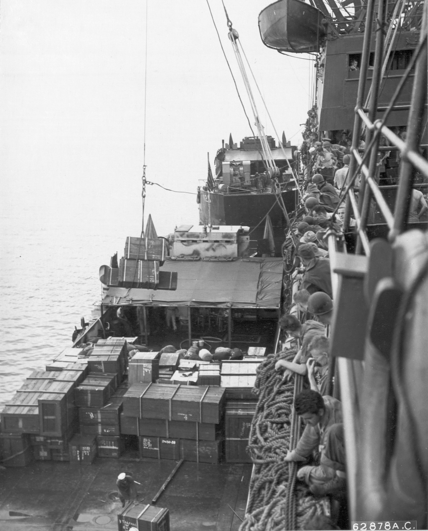 336k | US Army Air Corps troops transferring to LCT(5)-129 from the War Shipping Administration (WSA) transport SS