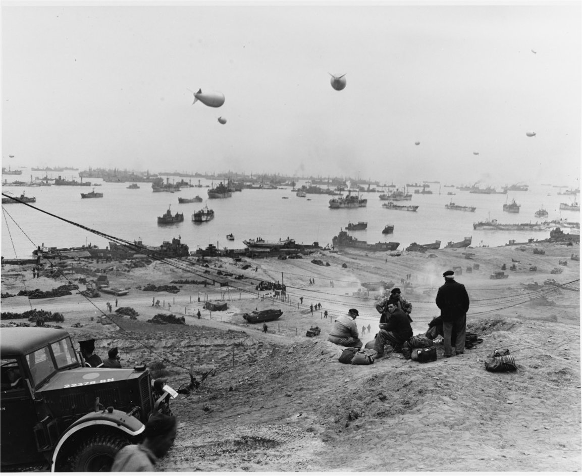 171k | View of the east end of the Mulberry 'A' Artificial harbor off Omaha Beach, showing the Gooseberry breakwater of sunken ships and unloading operations at