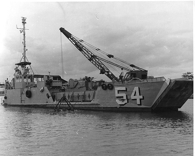 72k | YFU-54 and YFU-66 beached at Dong Ha, South Vietnam while off loading Army 175-mm howitzers where they provided fire support for US Marine operations in 1967. Photo from "All Hands" magazine, August 1967. |