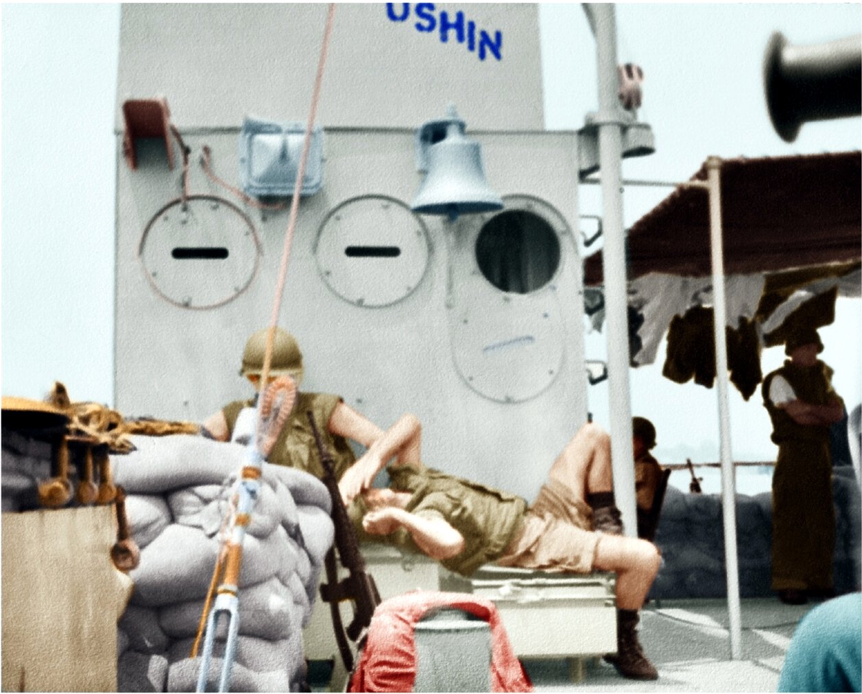 The Hospital Ship was staffed with international medical personnel. While proceeding into the Da Nang Harbor YFU-4 passed by while the nurses were taking a break out on the deck. The crew thought they had died and gone to Heaven. |